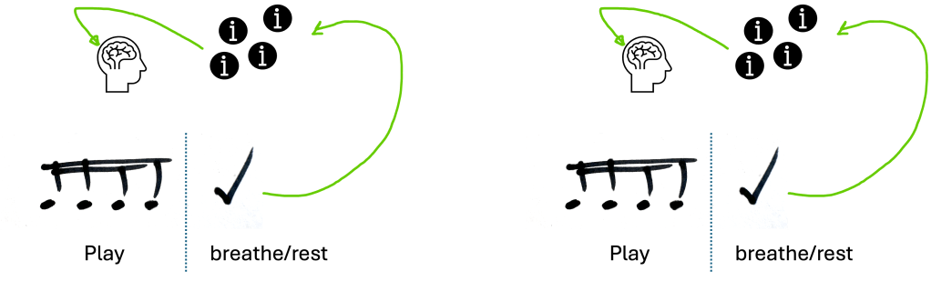 I am practicing chunking for the first time (1234, rest/breathe…. 1234, rest/breathe). It feels so unusual but I think I understand the concept. Remember: The most important part of this concept is the tiny rest after playing the chunk and taking a sip of air. It is in this moment where the magic happens.